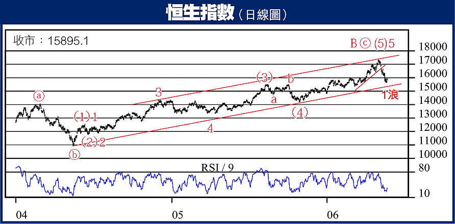本月8日恒指最高曾見17328,曾指出成交金額背馳,只有415億元,而4月19日恒指最高16898,成交高達477億元,反映動力不足,加上17328與當天250日線嚴重超買14.9%,9RSI也背馳,因此,假設B(c)-(5)-5浪即熊市二期反彈已見頂,開始1浪下跌。結果,急勁跌至上周四最低15627,共下跌1701點,跌幅9.8%,由於小時圖以(i)、(ii)、(iii)、(iv)及(v)浪運行,反映1浪下跌已屆尾聲。