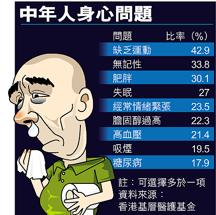 【本報訊】年紀大,機器壞。有調查顯示,87%受訪中年人表示有身心困擾,平均每人有兩項問題;但有35%受訪者只願意過了55歲才建立健康生活模式,59%沒有定期做身體檢查。有醫生強調,港人壽命愈來愈長,退休後平均也有十多年要過,中年人愈早改善生活習慣,老年的健康愈有保障。