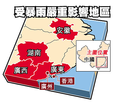 由於連場暴雨,西江、北江水位一度上升逾10米,其中西江支流北流江部份水文站的水位更超過警戒線。當局警告,目前廣東「隨時可能會發生極端的天氣災害」,防洪澇的工作已到關鍵時刻。
