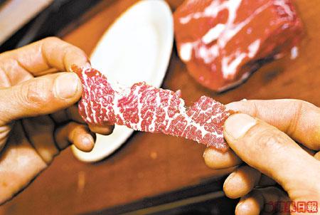 一隻牛只可製成兩客刺身,認真矜貴!選取牛脊心部位,落刀時厚薄要適中才能達到鬆化效果,肉質鮮嫩,惟肉味不夠突出。