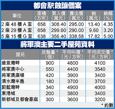 至於都會駅一期,自去年9月開售至今,已售近1600伙,目前市場最少有600個放盤,平均叫價每呎7000多元。據了解,除去年開售期間,有小量透過賣公司形式的二手成交外,至今市場只有3數宗二手買賣,全部蝕讓(見表)。