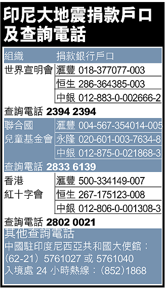入境處昨未收到港人求助,行政長官曾蔭權已致電印尼總統蘇西諾,向地震傷者及遇難者家屬致以深切慰問及哀悼,他說,目前有超過10萬名印尼裔人士在港居住,他們是香港社會的一分子,「我祝福他們,希望他們知道在這困難的時刻,我們會在背後給予支持。」