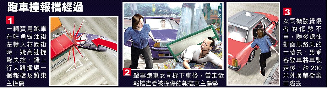 意外後,肇事跑車的女司機曾下車走近傷者查看情況,當她知悉報檔東主傷勢不重,慌忙跑往對面馬路截乘的士離開。至於跑車上一名男乘客,則跳上司機位,迅速將車駛走。