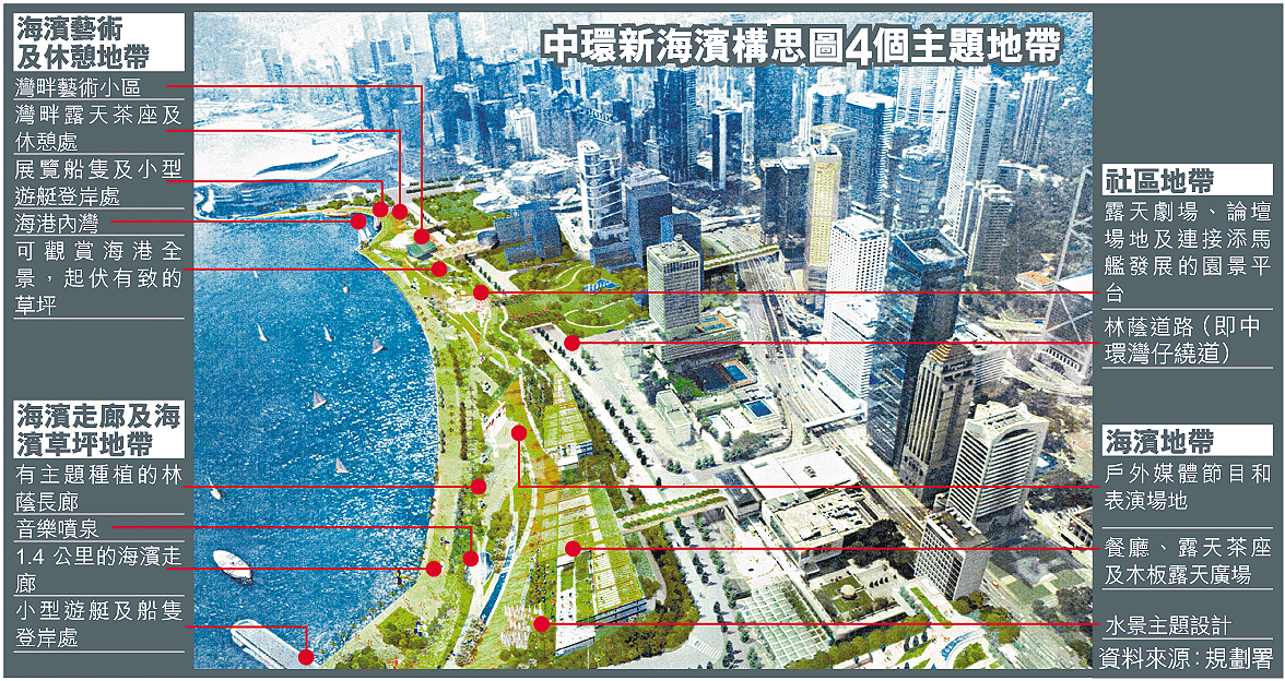 構思圖將海濱共分四個地帶,分別是設有戶外媒體節目和表演場地的海濱地帶;自成一角灣畔藝術區的海濱藝術及休憩地帶;設有露天劇場、論壇廣場及連接添馬艦發展的社區地帶;由灣仔會展至中環新天星碼頭共1.4公里的海濱走廊及海濱草坪地帶。