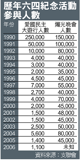 支聯會估計昨天約有1,100人參加遊行,警方則稱只有近600人。雖然參與人數是歷年新低(見表),但支聯會領導層不認為市民要求平反六四的心冷卻,相信只因受天雨影響。司徒華直指:「人多又係咁,人少又係咁,我哋係風雨不改;我唔擔心冇人,因為全世界嘅人,對六四事件都係在心中嘅。」