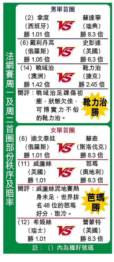【綜合法國外電】「1哥」瑞士名將費達拿周日在法國網球公開賽男單首圈,遇到意料之外的頑強對抗;與名不經傳、世界排名156位的阿根廷外圍賽球手夏菲德對壘逾3小時,才以7:5、7:6、6:2勝出過關。