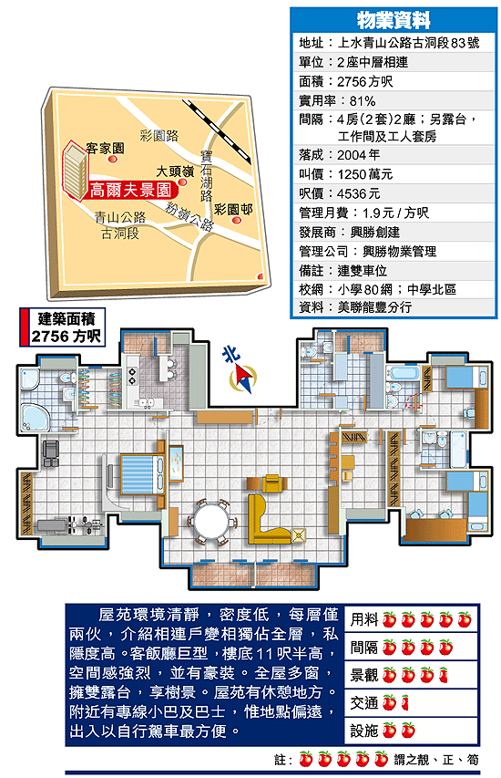 美聯王子俊表示,高爾夫景園有48伙,面積1312至1421方呎,戶戶有露台,1樓附平台,5樓連天台,各享戶外空間。目前二手放盤有7個,介紹的單位是唯一相連放盤,加上裝修落本,故叫價較其他放盤高近三成。另外,發展商尚餘1個貨尾,連天台,呎價近4000元。