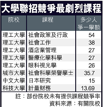 若以競爭激烈計算,則以理大及城大的課程較為激烈,以社會政策及行政課程競爭最激烈,達54人爭一學額。