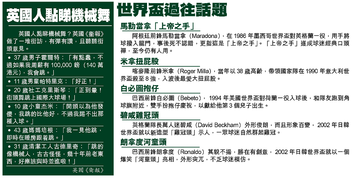 世界盃熱潮席捲全球,被視為今屆大熱之一的英格蘭,掀起了第一波世界盃潮流,但領導潮流的人,不是「萬人迷」碧咸(DavidBeckham)或「壞孩子」朗尼(WayneRooney),而是效力利物浦(Liverpool)的前鋒高治(PeterCrouch)。他在周二對匈牙利的熱身賽中,射入一球靚波後,即場跳了一隻「機械舞」慶祝。生硬得來又幾有型的機械舞,立即潮爆全英國,「機械球迷」隨處可見!