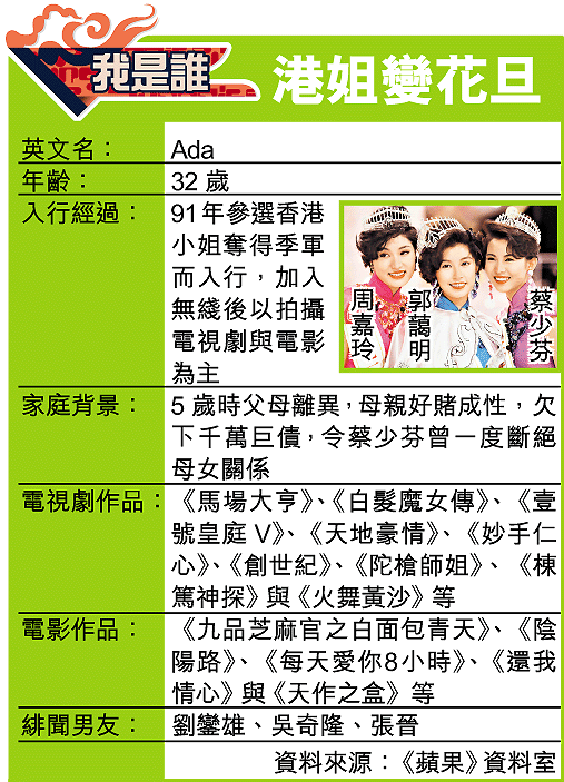 蔡少芬認為無綫劇集《火舞黃沙》中焦玉一角,跟她性格一點也不像,但戲如人生,就記者所見,其實她和焦玉很相似。焦玉為了幫兒子鋪路,不擇手段奪取當家之位,早年的蔡少芬,跟富豪劉鑾雄拍拖時,男方曾替其爛賭母親還了七、八千萬元賭債,分手後,蔡少芬狂接工作繼續為母親償債,她和焦玉都是為了家庭不惜賣命的人。蔡少芬和焦玉同樣逞強,早年蔡少芬拍劇途中接獲嫲嫲死訊,為了不想讓他人知道,惟有強忍淚水支撐下去。還有,焦玉這個當家,要牢守不少秘密,但最終秘密還是洩漏出去,而蔡少芬則為了不再讓人批判、為了捍衞她的愛情,選擇不再公開戀情,但大家都知道她有一個內地藝人男友,名叫張晉。也許,焦玉就是蔡少芬其中一面影子…… 撰文:戴彩煥
