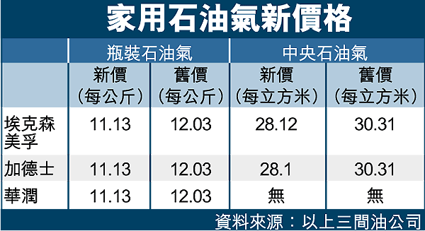 埃克森美孚的瓶裝家用石油氣,新價由12.03元減至11.13元,減幅為9角,而中央家用石油氣就由每立方米30.31元減至28.12元,減幅為2.19元。