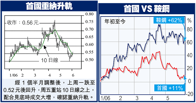 首國以鋼材製造及貿易為主業,05年度佔營業額84.23%,以鋼材股視之,絕對合適。目前鋼業龍頭股為鞍鋼(347),近期雖有調整,現價6.50元,連股息計仍較年初急升62%,但首國則只高出11%,落後好多。將首國訂喺0.80元上次目標價,已屬保守。見到0.80元,首國預測PE都只係11.4倍,P/B1.7倍,可能仲有進一步上升空間。