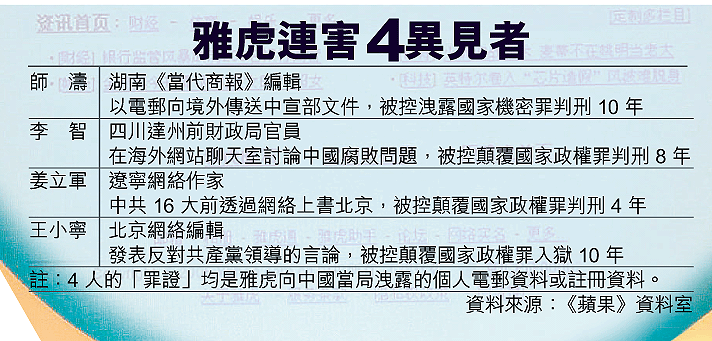 雅虎被指向中國當局提供用戶電郵資料,令曾透過電郵向境外傳送中宣部文件的湖南《當代商報》編輯師濤「非法向境外提供國家機密」罪成被判囚十年;而在海外網站設聊天室討論腐敗問題的四川達州市前官員李智,也被控顛覆國家政權罪,判刑八年。