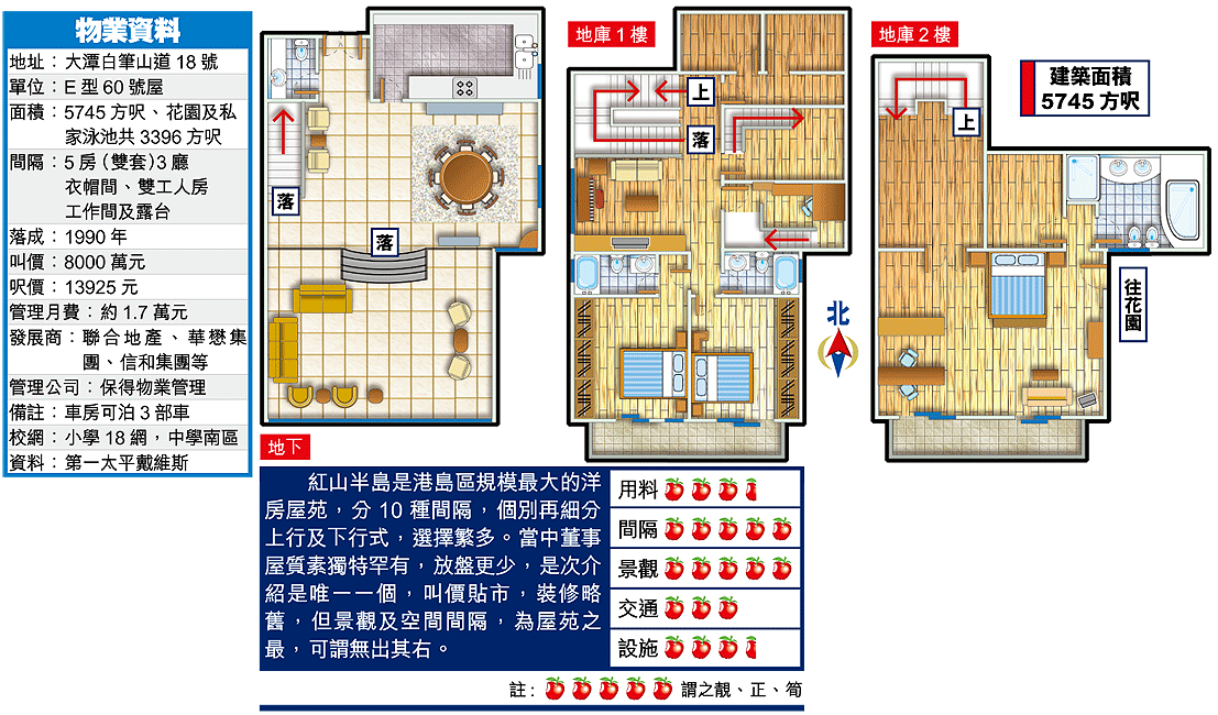 大潭紅山半島有洋房及分層單位,前者提供246座,6座臨海而建的董事屋獨立而建,較以排屋或孖屋形式興建的類別,私隱度高,花園也較大,由2200餘方呎起,更附連私家泳池。6座董事屋面積由2829至5745方呎,今次介紹是最大的一座,叫價8000萬元。