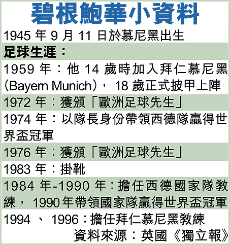 做不做國際足協會長也好,碧根鮑華都是球迷忘不了的傳奇巨星。長江後浪推前浪,對於現今球星,他又最欣賞哪位?不是德國同鄉,而是巴西「細哨」朗拿甸奴(Ronaldinho),「朗拿甸奴會再次告訴我們,世界盃是甚麼一回事。」
