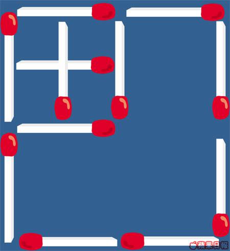 左邊是一個以火柴砌成的「田」字,連最外圍的大正方形在內共有5個正方形。現在考考你:可否只移動2根火柴使它變成6個正方形?(提示:火柴是可以交叉重叠的。)