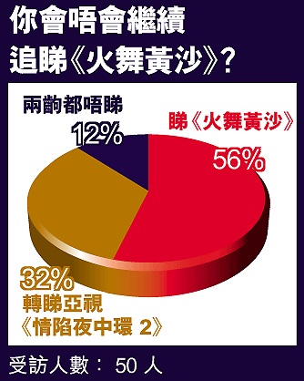本報日前在街頭訪問了50人,問他們會追看無綫的《火舞黃沙》還是亞視的《情陷夜中環2》,其中56%受訪者選看《火》劇,但大部份人均表示因慣性睇無綫,而非被劇情吸引;有32%受訪者嫌劇情太悶,所以轉台看《情陷2》,其餘12%觀眾就覺得現今的電視劇過於沉悶,所以兩劇皆不看。