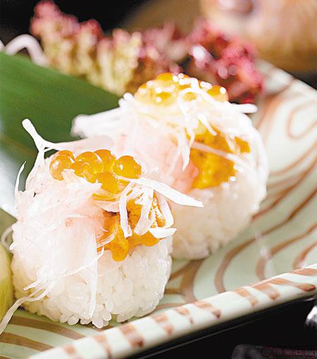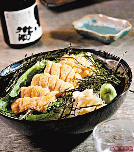 以西菜羅文葉,代替日式傳統的青瓜、紫菜,捲住貴價甜身的馬糞海膽嚟食,更能帶出海膽的鮮味,同時帶出海膽爽口感。