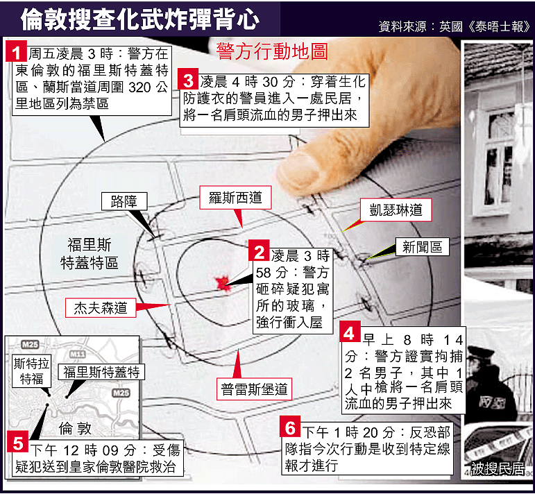 為免打草驚蛇觸發炸彈爆炸,逾250名警察前日凌晨乘黑出動,穿上全套生化防護衣,悄悄掩至東倫敦的福里斯特蓋特(ForestGate)區,目標鎖定鄰近韋斯咸球會球場一條寧靜小街的民宅。警方封鎖附近三條街,又將整個東倫敦上空列為禁飛區。
