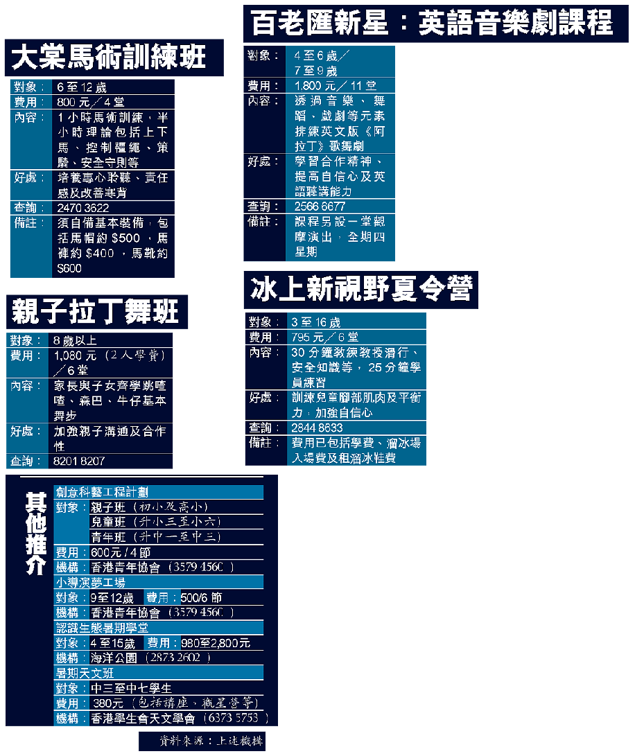 【本報訊】今個暑假家長可為子女選擇特色活動,包括騎馬、親子拉丁舞、英語話劇及溜冰,部份活動既可提升平衡力、改善寒背及身體線條,又能加強他們的自信心及合作精神,尚有其他另類暑期班,費用不過由數百元起。 記者:黃嘉寶 黃可欣