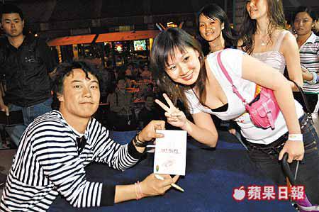 陳奕迅(Eason)前晚在馬來西亞一個露天場地舉行簽唱會,雖然下起微微細雨,但無損現場歌迷雅興,不少歌迷都撐着雨傘與Eason大合唱,有一位男歌迷更刻意模仿他在演唱會中的一個造型,頭戴一頂插上羽毛的帽子,結果Eason即場請他上台,說:「你今天刻意打扮來和我見面,請上來吧!」