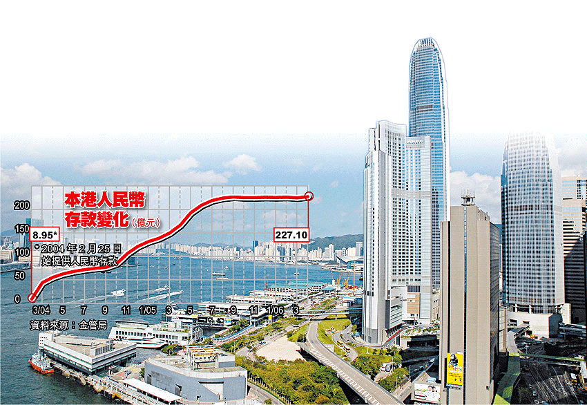 截至4月份本港認可機構的人民幣存款,較3月份微升1.1%至227億元,目前本地人民幣存款息率,最高僅約0.8厘,與港元存款息差相距約4厘;去年底新增的人民幣指定商戶開立人民存款服務,也只能「抬現鈔」而不准將港元兌換人民幣存入,加上存戶每日兌換人民幣限額,仍維持2萬元不變,均是未能帶動人民幣存款顯著增長的原因。