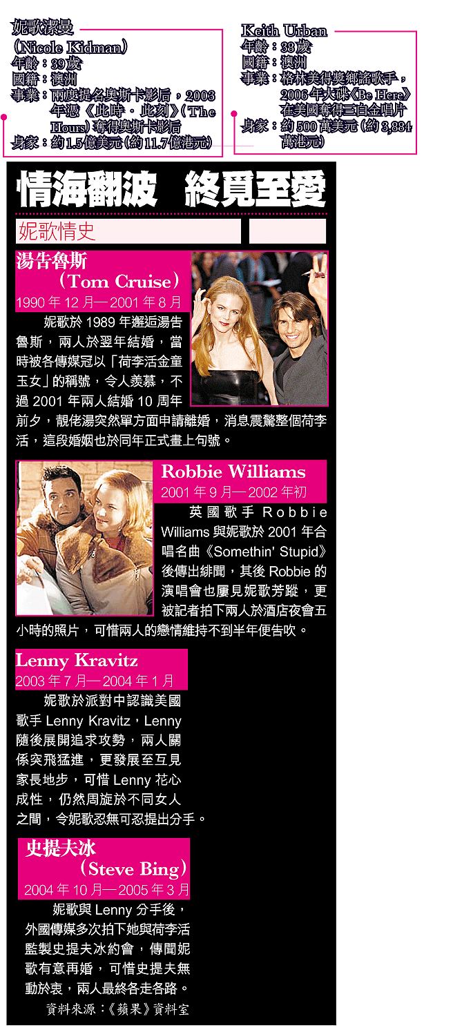 現年39歲的金像影后妮歌潔曼,去年與38歲的鄉謠歌手KeithUrban相戀,經過一年的愛情短跑,兩人於昨日澳洲時間下午五時(即香港時間下午三時)於悉尼曼利區的切雷蒂紀念教堂打造童話式婚禮。