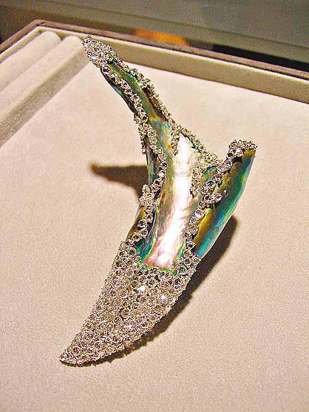 以罕有珍珠──鮑魚珠製造的胸針,「內紫外綠」,獨一無二,重近100卡,是收藏家的心頭好,價值40至50萬港元。RadianceJewellery