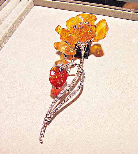 全手工製的墨西哥蛋白石心口針,襯以白鑽,高貴迷人,出口價80,000港元。RadianceJewellery