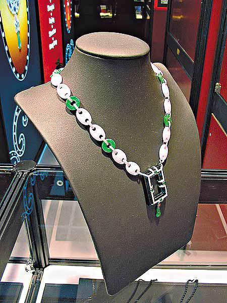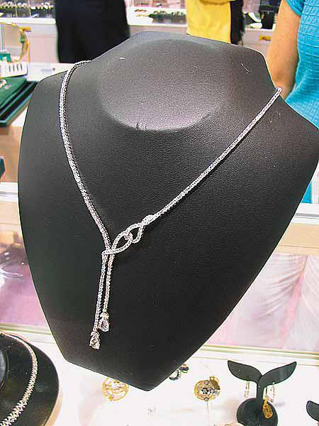 擁有多年參展經驗的WaddyJewellery,今年帶來一套以半寶石、白鑽及18K白金做成的頸鏈和吊墜,優雅脫俗,出口價約50,000港元。