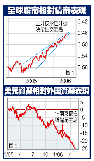 其實自2005年夏天開始,不獨是美債,全球其他地方的債券價格均持續往下跌,並自2003年起已遠遠跑輸給全球股市。不過,正如附圖1所示,股市相對債市的走勢在最近已形成了1個上升楔形,而類似的上升楔形一旦形成,隨之而來的,往往是1次既急且銳的下跌浪。