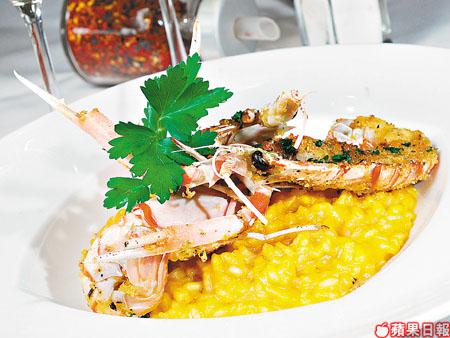 意大利飯與香甜南瓜茸是絕配,煮至半熟的飯粒質感煙韌有咬口,甜蝦加香料及蒜茸焗,蝦肉面層的蒜茸很脆口。