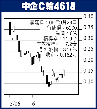 ■中企C輪4618收0.162元,升0.019元,成交305球。此輪06年9月28日到期,溢價6.0%,槓桿率11.9倍,有效7.2倍,引伸波幅37.9%,街貨18.8%。H指見6523時,此輪理論價0.193元,升19%。