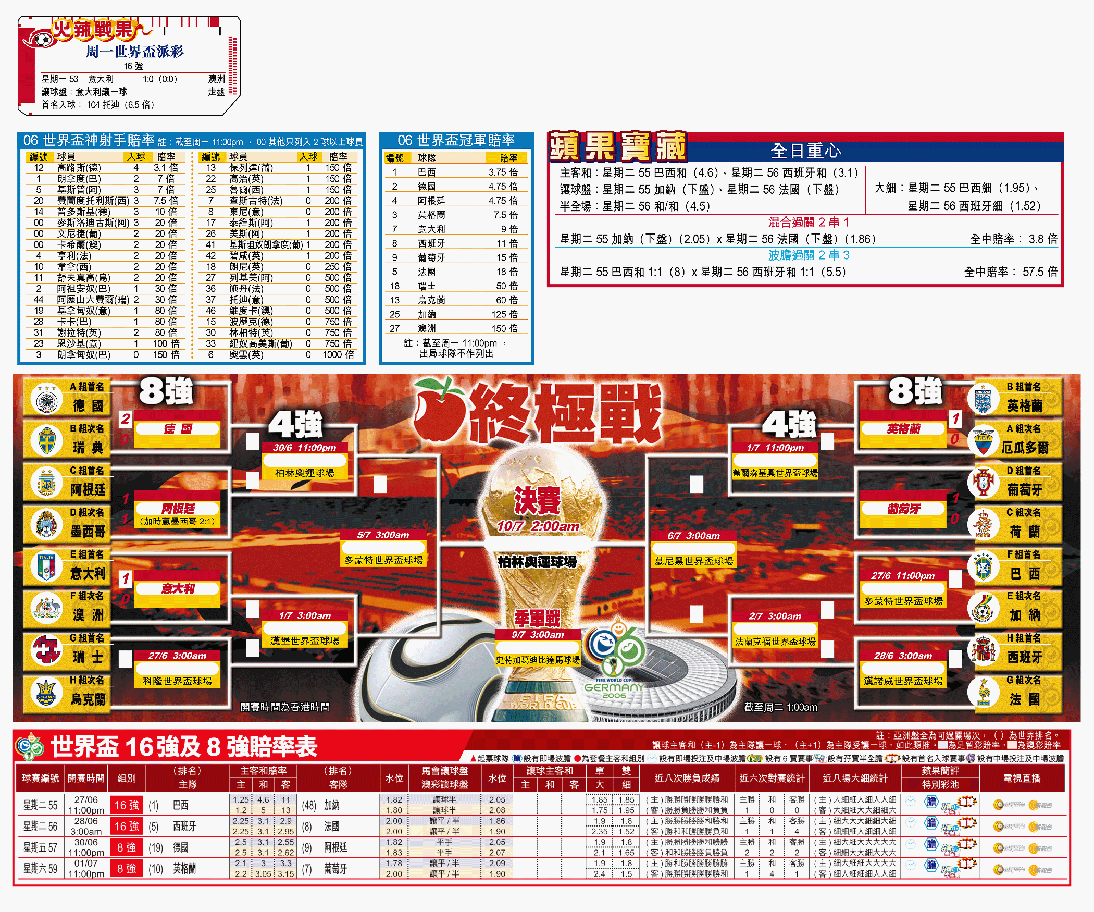 下半場以寡敵眾的意大利,於周一的世界盃16強賽憑格羅素補時2分55秒(球證補時3分鐘)博得十二碼,之後由托迪操刀得手,戲劇性地以1:0力克澳洲入8強,保住熱W。