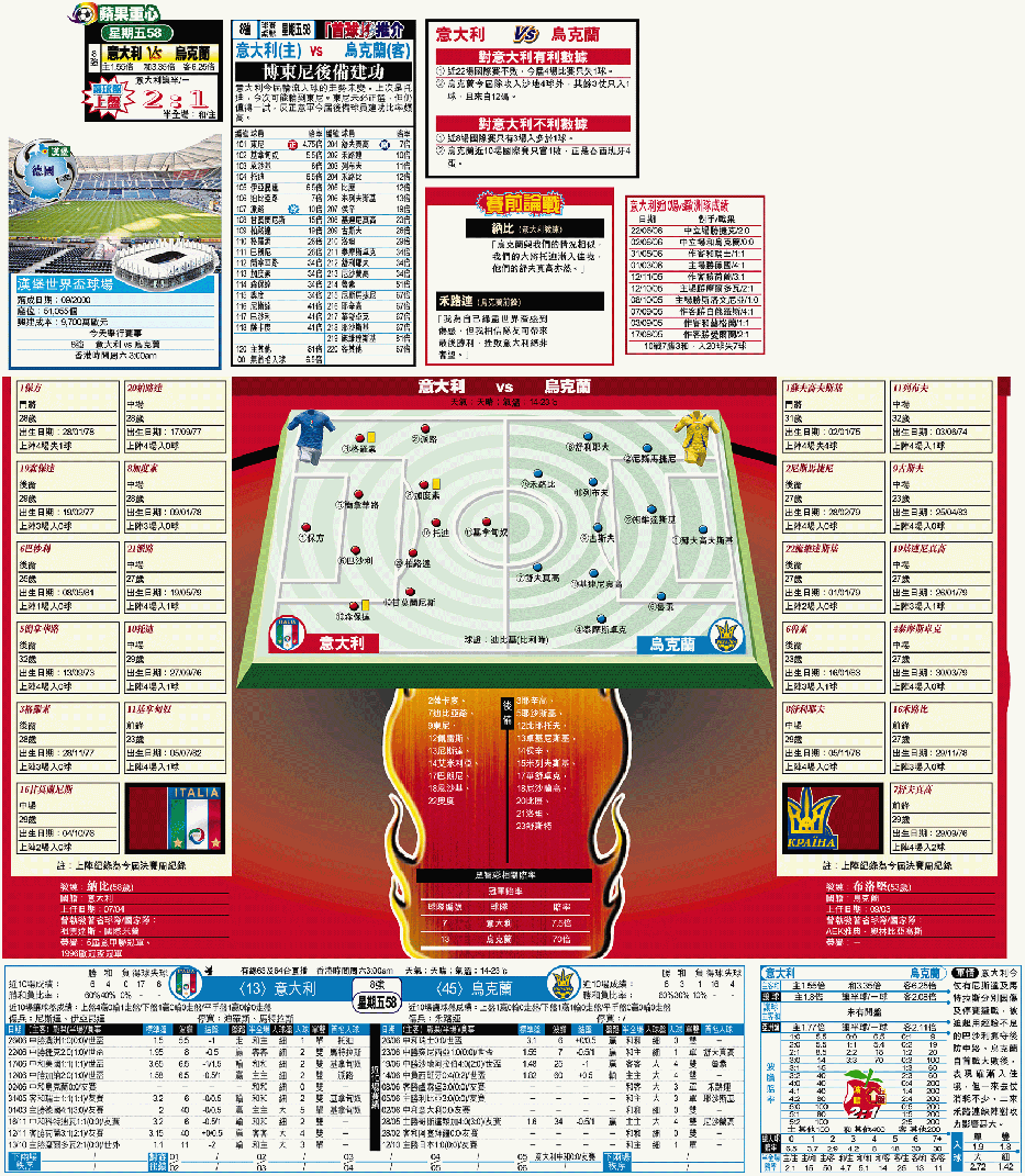意大利周五與烏克蘭在漢堡爭入4強,縱然意軍有尼斯達及馬特拉斯避戰,仍力足擊敗烏克蘭,讓球盤讓半/一低水,尚算是個上盤出擊位。(球賽編號:星期五58;有線63及64台明日3:00am直播)藍鑽石