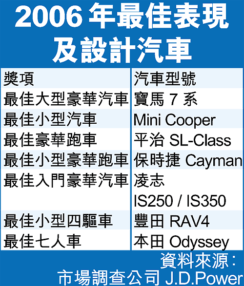 調查共訪問了美國當地63,000名購買了2006年款新車的車主,由他們在買車頭90天內就新車的表現及設計作出評分。