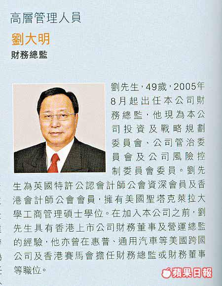 遇溺喪生的劉大明(49歲),去年八月起加入中遠太平洋有限公司(1199)出任財務總監,他本身是英國特許公認會計師公會資深會員及香港會計師公會會員,之前曾任惠普、通用汽車等美國跨國公司和香港賽馬會擔任財務總監或財務董事。
