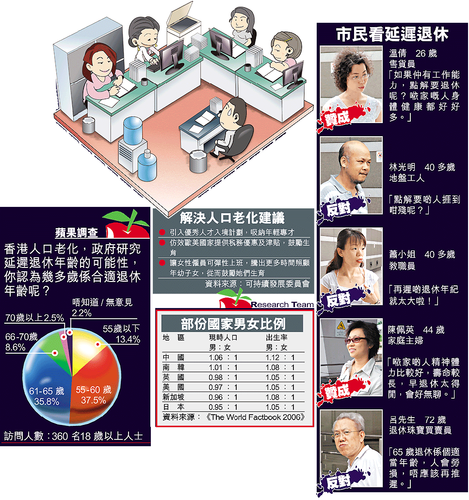 由政務司司長許仕仁領導的可持續發展委員會,轄下的人口政策支援小組昨日發表報告,針對到了2033年本港將面對出生率下降、人口老化、男女失衡等問題,並提出多項建議(見表)。小組將進行為期四個月的公眾諮詢,詳情可見可持續發展策略網站www.susdev.org.hk。