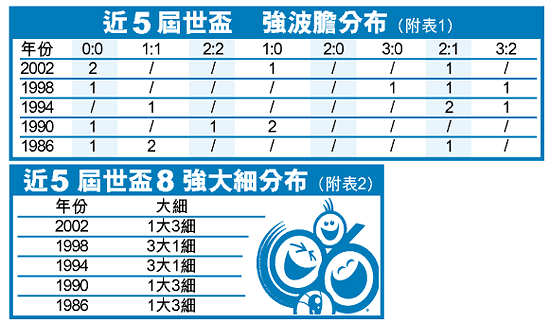入球大細方面,似乎有迹可尋:就是近5屆8強中,平均每屆不是開出1「大」3「細」,便是開出1「細」3「大」(見附表2)。即如今晚的德、阿戰及之後的意、烏戰先後開「大」,明晚的英格蘭對葡萄牙及巴西對法國開出1「大」1「細」較高,如此類推。以上數據畢竟只是近屆8強「大細」的比率參考,球迷相信與否便要自行判斷了。