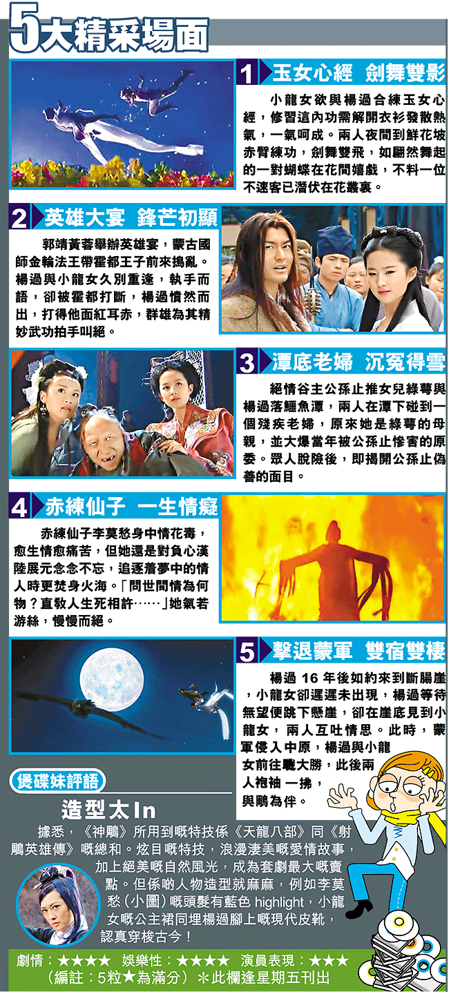 金庸曾說:「《天龍八部》是一種豪氣衝天的美感,突出好男兒的一種陽剛之氣。《神鵰俠侶》則是感情的唯美,愛情的浪漫。」以此看來,06年版本的《神鵰》的確十分符合金庸所要求的浪漫憂傷的調子。此劇將於下月十日起在無綫播映。