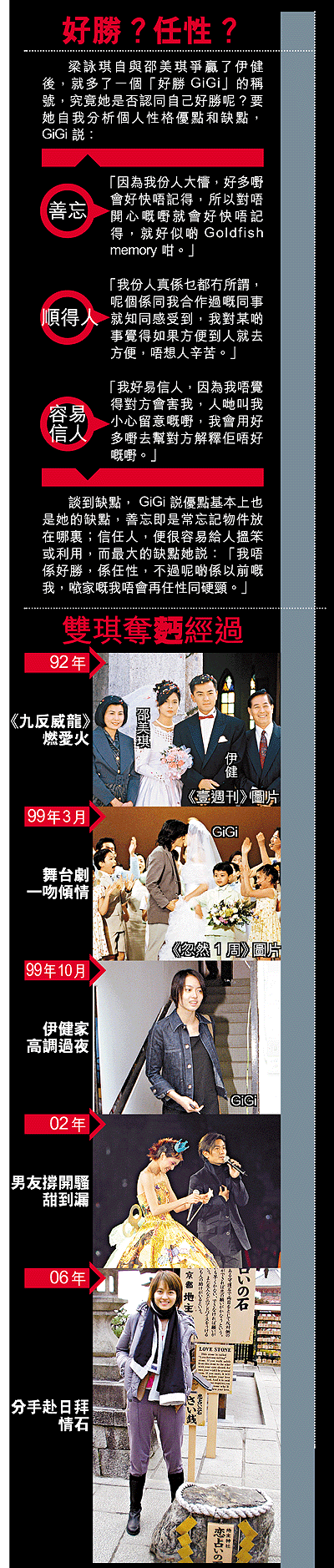 一對分了手的情侶,彷彿仍有一條無形的線將兩人綑綁着,雖然沒有了戀人的名份,但仍保持着戀人的觸覺,當坊間正不斷吹噓及期待鄭伊健跟邵美琪復合的新聞湧出來時,永遠背着鄭伊健名字包袱的GiGi說:「分咗手都係朋友,一個普通朋友拍拖都係一件開心嘅事,我會當佢係一個普通朋友祝福佢,佢同邊個一齊,都會尊重佢嘅決定,因為係值得開心嘅事。」還有跟對方聯絡嗎?她笑說:「少喇,因為我開始過新生活嘛。」