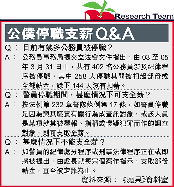 另一名前高級督察劉國輝,先後因違反交通法例和非禮罪成,須接受警隊紀律聆訊,最後被勒令停職及不獲支薪,他入稟高院申請司法覆核,結果敗訴。劉國輝曾透露,警隊中其他被停職支全薪的個案,包括一名警長停職超過6年,總支薪200多萬元;一名高級警員停職2年,支全薪約60萬元。