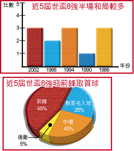 至於「首球」方面,近5屆8強數據顯示,當中較旺前鋒球員先開紀錄,20場賽事便有9次是前鋒取得「首球」(見附表2);包括上屆的英格蘭前鋒奧雲、98年的荷蘭前鋒古華特及94年的巴西前鋒羅馬里奧等,通常會在8強入波兼「首球」。其餘中場球員及後衞則各佔5次及1次,「無首名入球」更多達5場(因近5屆8強常開出0:0波膽)。