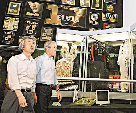 在印度路過泰姬陵都不入的喬治布殊,這次卻專誠陪小泉參觀Graceland,可說給足面子。不單如此,兩人一同飛往孟菲斯時,「空軍一號」更播放貓王名曲,又預備了貓王的電影,甚至餐單上也有貓王最愛的炸花生醬香蕉三文治。
