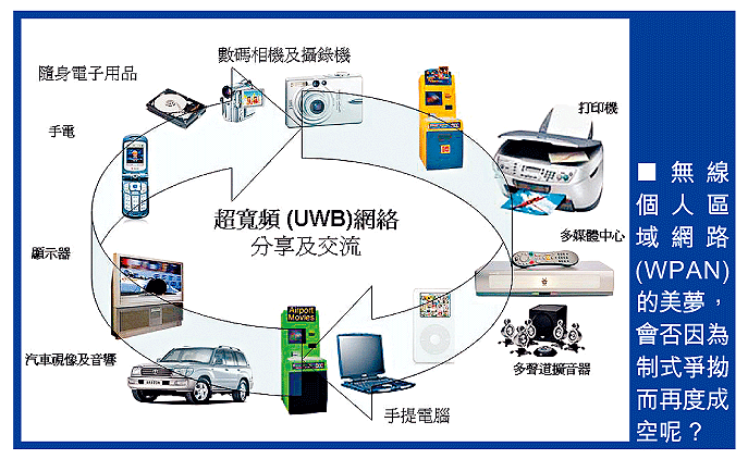 藍牙技術的目標,就是以低成本技術把各類電子消費產品以無線網絡連接起來的技術,亦即是所謂的WPAN技術。其實,一個名為超寬頻(Ultra-wideBand,UWB)的技術,本來大有機會成為未來WPAN接班人,可惜兩大制式陣營未能達成協議,弄得一團糟。