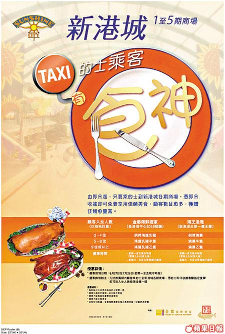 搭的士送燒鵝髀?堅定流呀?我聽到都打個突,絕對無吹水!𠵱家搭的士去新港城各期商場Shopping,只要於晚市時段幫襯指定食肆,出示即日的士收據即送乳豬或燒鵝,有着數咪走寶呀。記者:陸伊琳