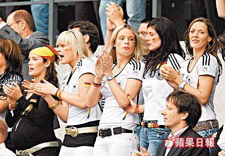 幾時都話一個成功嘅男人背後一定有個女人,何況是在祖家比賽面對的又是勁敵阿根廷的德國球員,而作為大國腳背後的女眷,當「老公」或「男友」在綠茵場上東奔西跑又怎可以吝嗇氣力! 看看這群又嗌又叫又拍掌的德國「太太團」,身體力行拉起一幅寫着「你們可以做得到,我們就在你們的背後」的大橫額打氣,德國球員自然全力以赴答謝另一半的支持。 此外,「凱撒大帝」碧根鮑華都與太座凱迪,聯袂觀看這場精采賽事,在公在私為德國隊打氣。