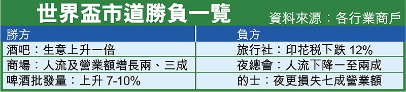 【本報訊】世界盃有贏有輸,歷時一個月的世盃賽事,各行各業亦有得有失。酒吧錄得一倍的生意升幅,商場人流顯著激增。另一邊廂,旅遊業和夜總會卻大吹淡風,炎夏裏過着嚴冬的日子,直至最近才有起色。周日(7月9日)決賽在即,相關行業已磨拳擦掌,準備終極一戰。 記者:蔡元貴