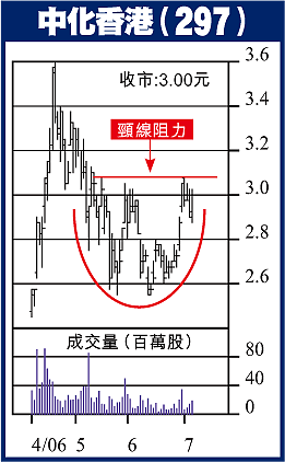 中化香港(297)走勢又見有突破之兆,收3元,升7.5仙,大圓底收集完成,10日線今日將升破50日線,中期上升大浪即確認,升破前高位3.075元後,第1個上升目標係3.60元。