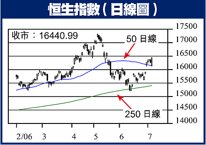 恒生指數昨日出現戲劇性的表現,由開市時跌穿50日線約16150後,到收市突破16400關口,上升173,完全沒有理會亞太區股市的跌勢,亦沒有理會美股的調整,似乎反映出大市的市底仍然偏強,惟昨日尾市期指走勢相當飄忽,尤其是最後30分鐘,期指在突破16500點後急速回落,成交亦顯著上升,似乎反映出部份投資者對後市仍有戒心。大市能否在短期內再發力上升,上試16700關口,似乎值得商榷,或者先留意油價及美股走勢,才再作出進一步行動。